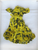 The Dress Series evokes the doll clothes and paper dolls of childhood. They are happy little dresses, yet evoke something else that is ominous. The departure comes in the materials chosen: woven plastic discards that have been burnt and manipulated. Pins pierce the waist. Some are wrapped. Some are mired in wax It is an embattled femininity. | ![]() |