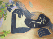 Jacob Lawrence's influence is seen in my paintings in the flattened picture plane as well as the choice of bright colors. Figures are exaggerated and abstracted. Faces are masks. His vernacular is also seen in the interiors, such as living rooms and bedrooms, intimate spaces where people can be themselves. There is narrative within these spaces. With Lawrence, "this narrative quality was, and still is, the essence of Lawrence's vision" (Bearden and Henderson 299). In my paintings the narrative is equally essential. In the Living Room series, the tension of the Racist series is missing. Spiritual and temporal spaces do not have to be bridged, they reside peacefully with each other. It is in our intimate spaces that we can let down our guard and let go, where anything can and does happen. Within these comfort zones, surrender is more likely. And within this surrender, occupants of the spiritual zone may enter. Note how they are juxtaposed next to mundane item of our American culture, a TV set. It's a comment on how the sublime and the ordinary reside next to each other.